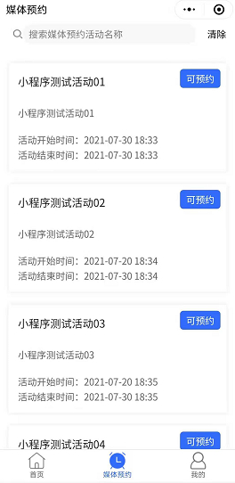 在“媒体预约页”中,您可通过列表获取所有媒体活动的基础信息,并进行活动预约。“媒体预约页”同时支持模糊搜索,在搜索框输入文字,点击“搜索”,即可查找出您想搜索的活动。