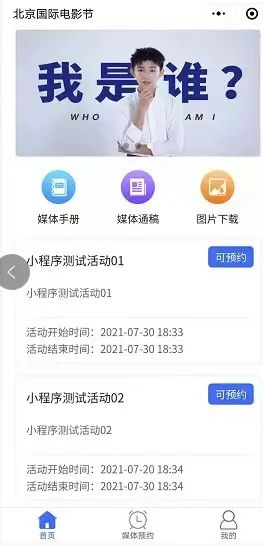 “第十一届北京国际电影节”微信小程序主要划分为“首页、媒体预约、我的”三大板块。