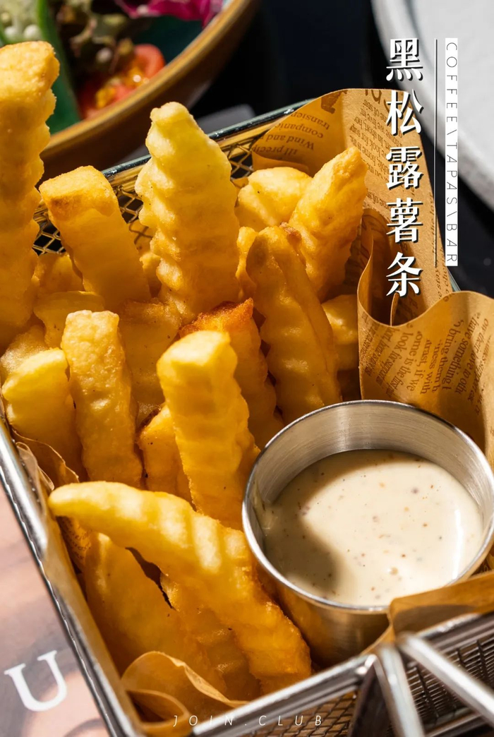 装在小推车上出品的厚切粗薯条,带有几分可爱~蘸上细腻香甜的黑松露沙拉酱,浓香酥脆的简直不要太享受!