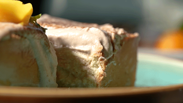烤后外酥里嫩的厚吐司,上面那朵使用芒果片制成的精致玫瑰花,成了它的点睛之笔。淋上巧克力味的奶油后再撒上可可粉,微甜不腻,今天的甜点快乐到位了!