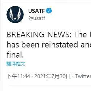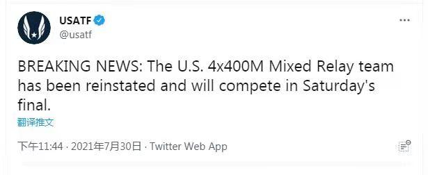 中新网7月31日电 北京时间30日晚,东京奥运会男女混合4x400米接力赛第一轮,夺冠热门美国队因接棒时站位超出规定区域被取消资格。随后,美国田协宣布,美国男女混合4x400米接力队恢复晋级资格,将参加31日的决赛。