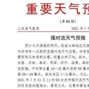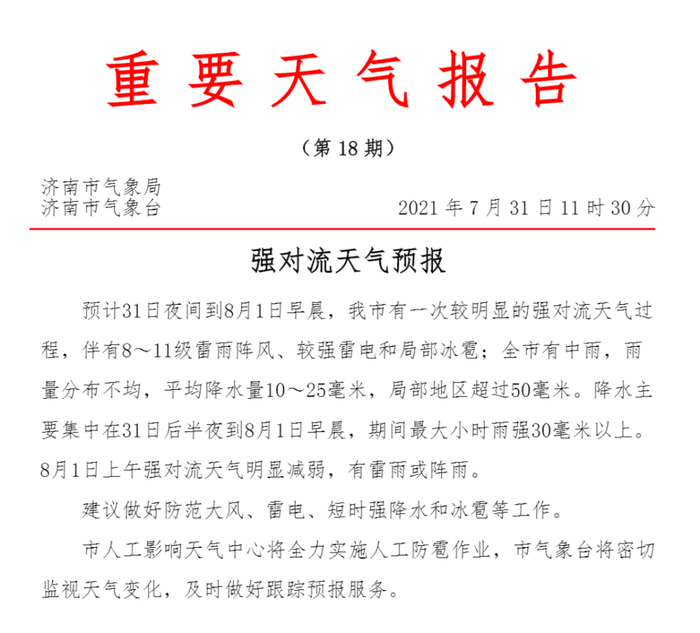 为此,山东省气象台于7月31日11时发布强对流天气预报,建议及时做好防范短时强降水、雷雨大风、冰雹和雷电等工作。