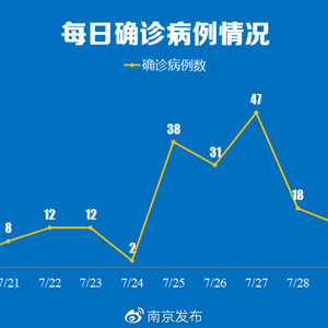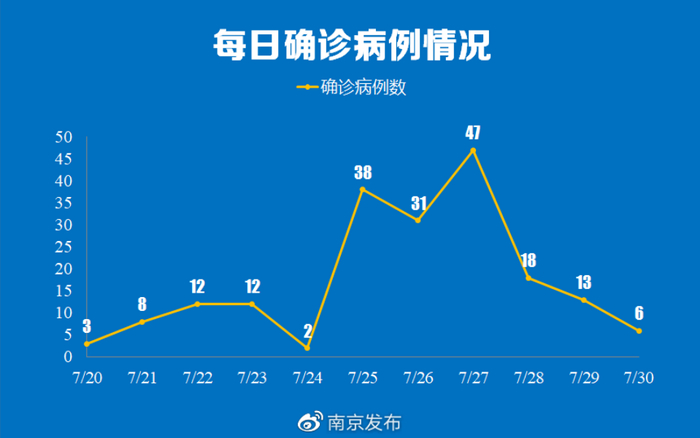 从每日确诊病例数据来看,南京自7月20日确诊3例病例,21日确诊8例后,7月22、23日均确诊12例,在7月24日回落至2例后,7月25~27日,连续三天新增确诊病例都在30例以上,其中27日达到目前的最高值47例。随后新增确诊病例连续3天回落,到7月30日再次回落至个位数(6例)。