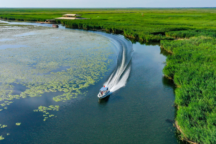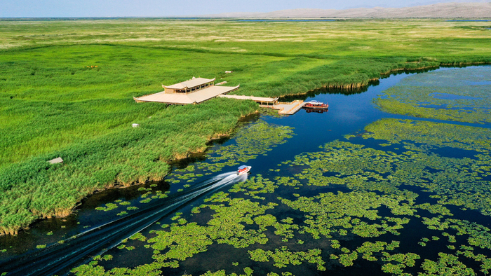 央广网博湖7月31日消息(记者 罗成 通讯员 年磊)夏季,位于新疆博湖县境内的博斯腾湖迎来旅游旺季,这里融江南秀色与塞外壮美于一体,游客乘船荡漾其间,构成一幅“船在水中行、人在画中游”的绚丽画卷。
