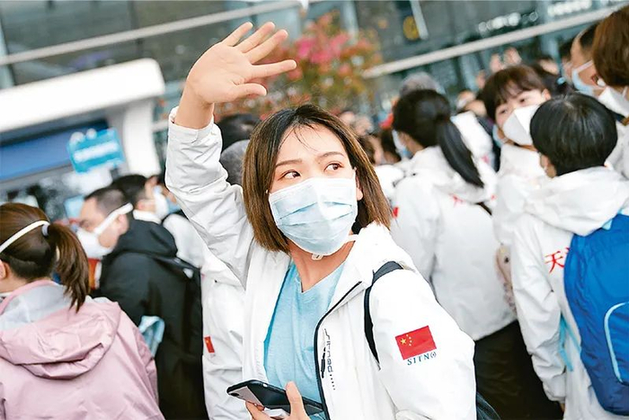 面对疫情,中国共产党统揽全局、统一领导,以科学精神和科学态度领导组织党政军民学、东西南北中大会战。图为2020年3月17日,在武汉天河机场,完成援鄂任务后随队撤离的天津国家紧急医学救援队队员向送行的人们挥手告别。 新华社记者 熊琦/摄