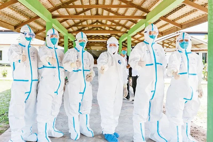 中国秉承“天下一家”理念,与180多个国家、10多个国际和区域组织开展疫情交流与合作,发起了新中国成立以来援助时间最集中、涉及范围最广的紧急人道主义行动。图为2021年5月10日,中国抗疫专家组在老挝北部乌多姆赛省准备进入新冠肺炎确诊患者隔离病房。 新华社发 农丽春/摄