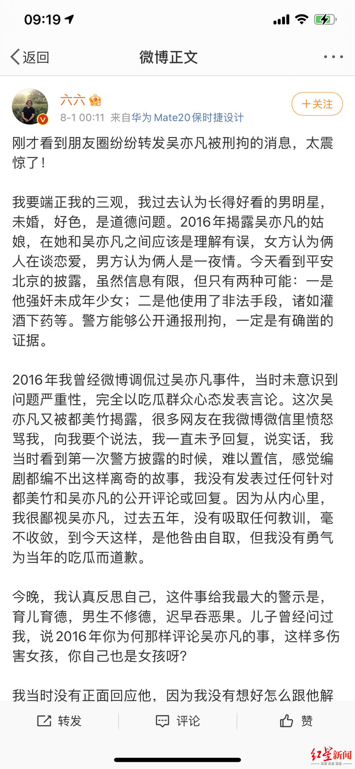 编剧六六称,看到吴亦凡被刑拘的消息非常震惊,“我要端正我的三观”了。2016年的时候,她没有意识到事情的严重性,只是以吃瓜群众的心态发表言论。而这一次,当第一次看到警方通报时,她难以置信,觉得编剧都编不出这么离奇的故事,警方能够公开通报刑拘,一定是有确凿的证据。