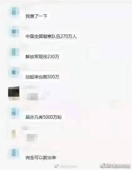 脑残重症粉丝群中有人说“吴亦凡有5000万粉丝,解放军和警察队伍加起来也就500万,完全可以救出来”的。