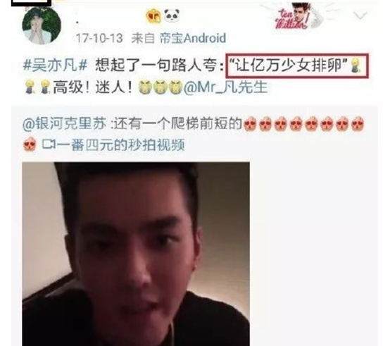 而吴亦凡的“饭圈”毫无疑问是圈中馊臭的最典型代表。早在2017年,吴亦凡粉丝发明的网络用语“坐地排卵”就曾名列当年最令人作呕的网络用语。