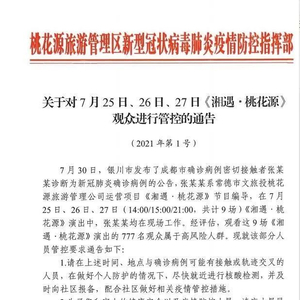 8月1日,湖南常德市桃花源旅游管理区新型冠状病毒肺炎疫情防控指挥部发布消息称,在7月25日、26日、27日观看9场《湘遇·桃花源》演出的777名观众属于高风险人群。