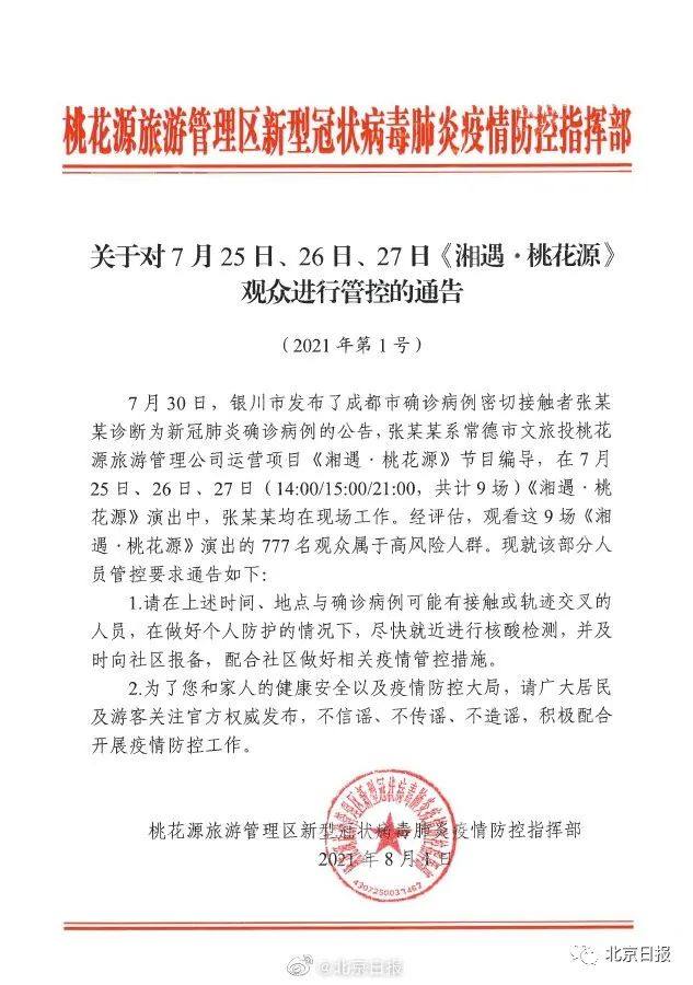 通告称,7月30日,银川市发布了成都市确诊病例密切接触者张某某诊断为新冠肺炎确诊病例的公告,张某某系常德市文旅投桃花源旅游管理公司运营项目《湘遇·桃花源》节目编导,在7月25日、26日、27日(14:00/15:00/21:00,共计9场)《湘遇·桃花源》演出中,张某某均在现场工作。经评估,观看这9场《湘遇·桃花源》演出的777名观众属于高风险人群。