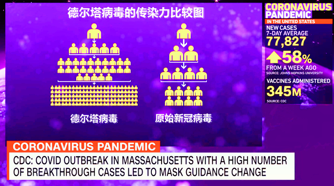 CDC发布的报告称,一项最新研究表明,在被感染的已经接种了新冠疫苗的患者中,产生了与未接种新冠疫苗患者同样数量的病毒,而且具有同样的传播倾向,也就是说已经接种了新冠疫苗的人群可以同样传播德尔塔病毒。在对马萨诸塞州巴恩斯特布尔县7月份469名德尔塔病毒感染患者群的研究发现,有74%患者是接种了新冠疫苗的二针注射的,被称为“突破感染”(Breakthrough),同未接种新冠疫苗的患者相比,他们有同样的病毒载量,同样的症状和严重程度,但是没有人死亡。这项针对接受了免疫注射的患者群的比较性研究还在继续,包括治疗时间、恢复程度等。