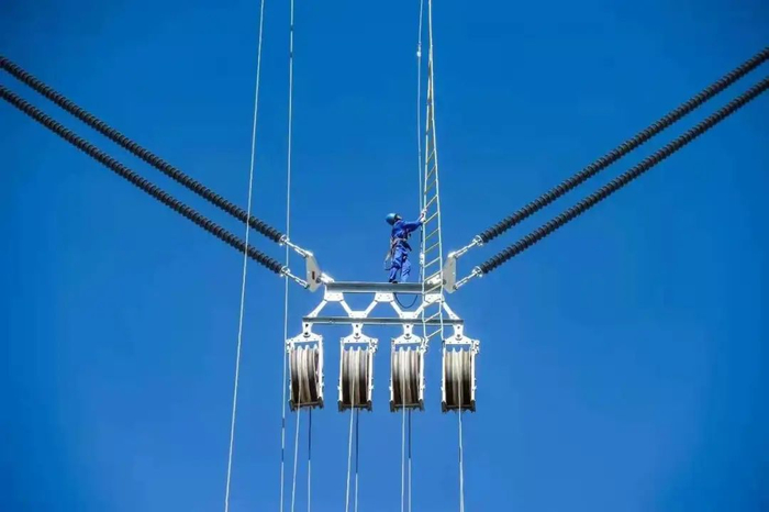 电力建设者攀爬在昌吉—古泉±1100千伏特高压输电线上 摄影@ 宋鹏涛 星球研究所