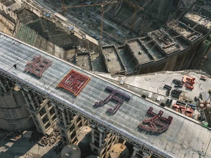 白鹤滩水电站的建设者摆出“祖国万岁”的字样摄影@黄正平星球研究所