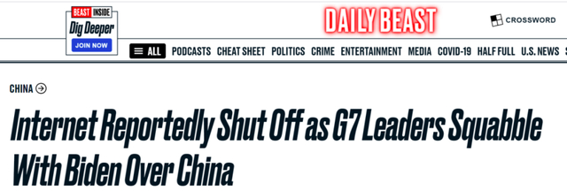 美国《野兽日报》:“由于七国集团(G7)领导人与拜登就中国问题发生争执,(房间里的)互联网据称被中断”