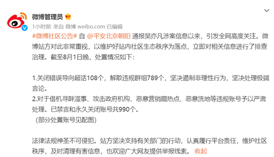 晚10时,@微博管理员发布微博社区公告称,自 @平安北京朝阳 通报吴亦凡涉案信息以来,引发全网高度关注。微博站方对此非常重视,以维护好站内社区生态秩序为落点,立即对相关信息进行了排查治理。截至8月1日晚,处置情况如下: