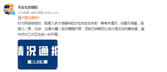 此前7月31日晚,北京朝阳警方发布信息,针对网络举报的“吴某凡多次诱骗年轻女性发生性关系”等有关情况,经警方调查,吴某凡(男,30岁,加拿大籍)因涉嫌强奸罪,目前已被朝阳公安分局依法刑事拘留,案件侦办工作正在进一步开展。