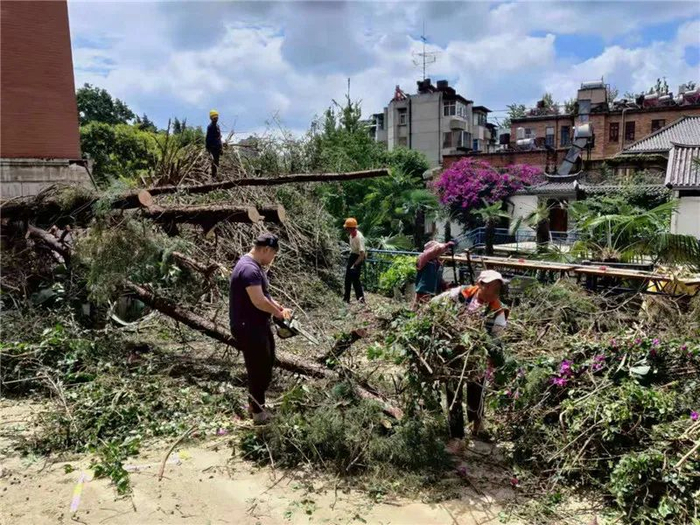 7月29日早上8点,徐菲和另外一位工作人员组织了15位工人前来清理现场。“因为附近的道路不是很宽,所以没办法使用吊机来处理,只能通过把树锯断,一点一点地搬下去用车拉走。”