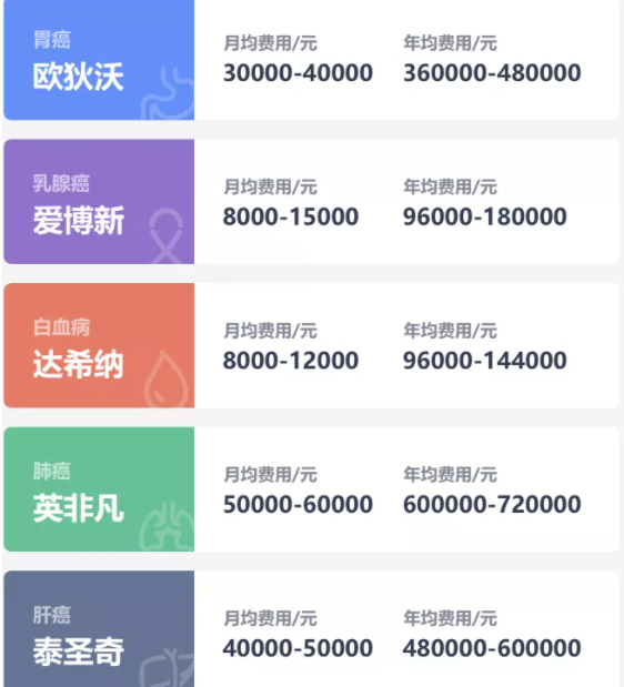 具体来说,常见癌症特药的药品单价及预计年总费用,这些都不在医保报销范围内: