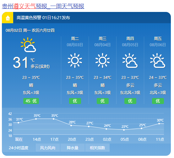 周一至周日午后省的东部地区、南部边缘部分县市以及赤水河谷有35℃以上的高温天气,局地将超过38℃。