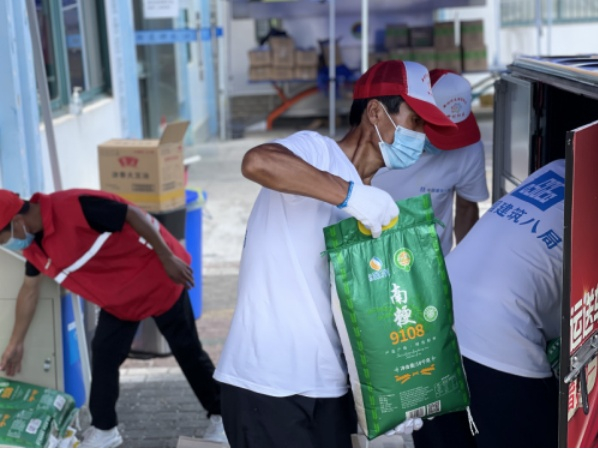 党旗飘扬,持续服务“有后劲”。南京疫情拐点尚未到来,禄口街道志愿者队伍依然短缺,7月29日,文旅分公司再次集结员工、工友共计50人,组成第二批志愿者服务队,驰援禄口。志愿者服务队于7月30日到达,成立中建八局禄口临时党支部,召开会议根据禄口街道各社区需求做好前期物资准备、人员分组、工作对接等任务分配。每天早上7点前临时党支部书记开完安全早班会后,服务队迅速分为5个小组,奔赴6个社区开展工作。因禄口街道被调整为高风险区域,居民居家隔离,为让群众生活不受影响,志愿者们往往需要将整袋的大米、食用油等一件件搬运到居民门口。汗水浸透了志愿者们的衣衫,党旗在抗疫一线高高飘扬。
