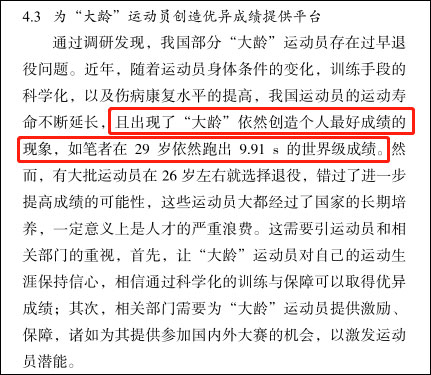 最后,文章称,未来要保持中国男子100m短跑高质量发展,要为“大龄”运动员创造优异成绩提供平台:“近年,随着运动员身体条件的变化,训练手段的科学化,以及伤病康复水平的提高,我国运动员的运动寿命不断延长,且出现了‘大龄’依然创造个人最好成绩的现象,如笔者在29岁依然跑出9.91s的世界级成绩。”