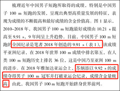 但论文毕竟是研究新时代中国男子百米短跑,当然要提创造中国男子短跑历史的苏炳添。于是,这篇文章开始高频出现“笔者”自己创造的成绩。
