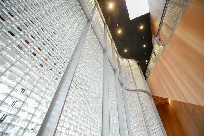 进入北京国际戏剧中心一层大厅,一面挑高的L型玻璃砖墙,吸引了北京日报客户端记者的目光。夏日午后,从玻璃折射的阳光与大理石地面反射的光线交相呼应,形成一道光影幕墙,既让前厅显得更加明亮,又增加了剧场内部的艺术美感。仔细一问,这面长60米、高12米的玻璃砖墙,竟由32000块玻璃砖构成。