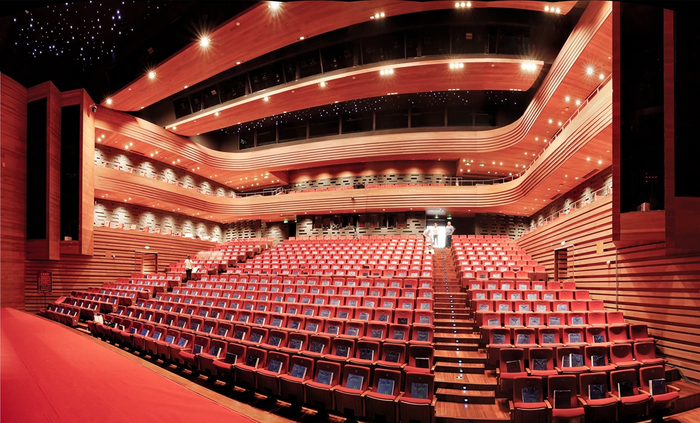 一座先进的剧场,舞台同样关键。中剧场曹禺剧场,墙面由经过特殊防火处理的上万件吸音材料装配而成,音响采用的是全息声技术,就连座椅上的红色靠垫也全部采用吸音材料,让观众在未来欣赏演出时更有“声临其境”之感。
