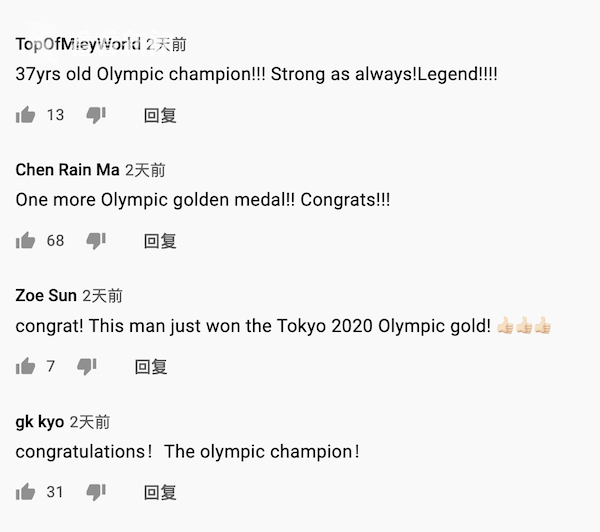 吕小军获得金牌后,又有大量网友涌到这些视频底下祝贺:“37岁的奥运冠军!简直就是传奇!”
