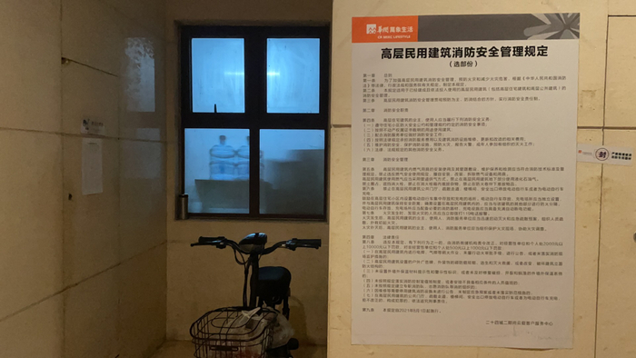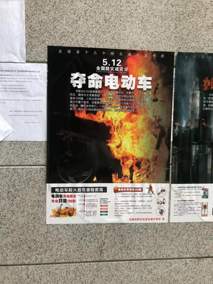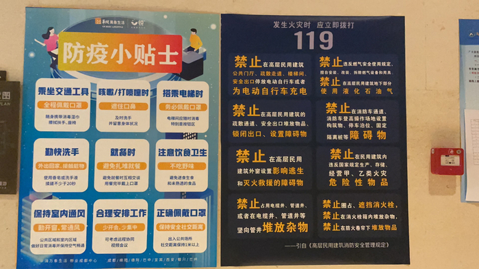3日上午,四川发布来到成都市成华区双成三路某小区电梯住宅楼看到,在每个单元楼大门进出口的门柱上都张贴了“单元门口禁止停放非机动车辆”的标识及“电瓶车进电梯危害大,小区安全控制靠大家”的宣传口号;进入单元门的右侧公告栏上《高层民用建筑消防安全管理规定》海报全文张贴在墙上,另外在张贴栏处,“禁止停放非机动车”的相关规定,也单独列出来,放在了第一栏。