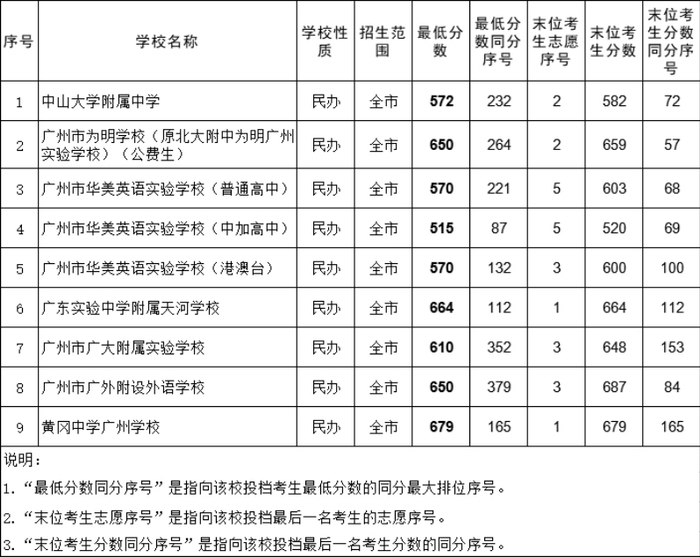 在第三批次的招生学校中,民办学校主要有7所,包括中大附中、广州市为明学校、华美英语实验学校、省实天河、广大附属实验学校、广外附设外语学校、黄冈中学广州学校。