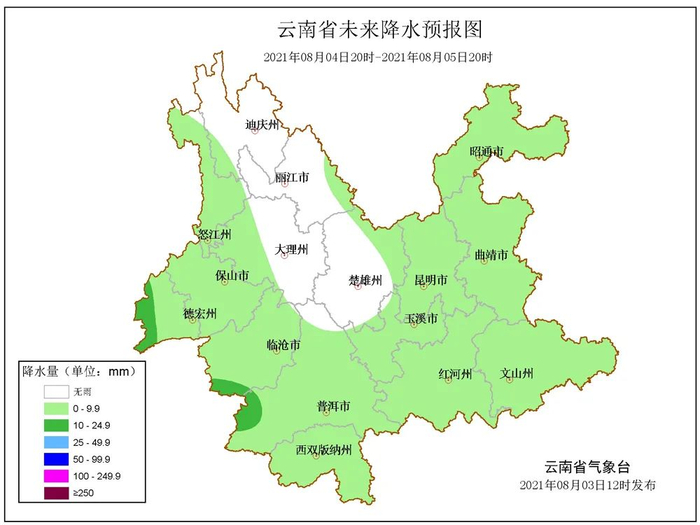 8月3日20时-8月4日20时:怒江西部、保山 、德宏、大理西部、临沧、普洱、西双版纳、玉溪南部、红河南部、文山南部多云有阵雨局部中雨,其它地区晴间多云。