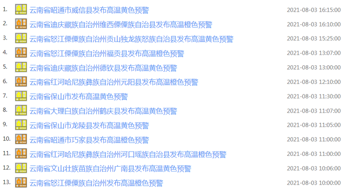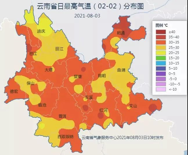 云南省气象台2021年8月3日09时45分发布高温黄色预警:预计未来24小时,金沙江河谷、元江河谷、澜沧江河谷部分地区最高气温将达到35℃以上, 其中昭通北部最高气温将超过40℃。