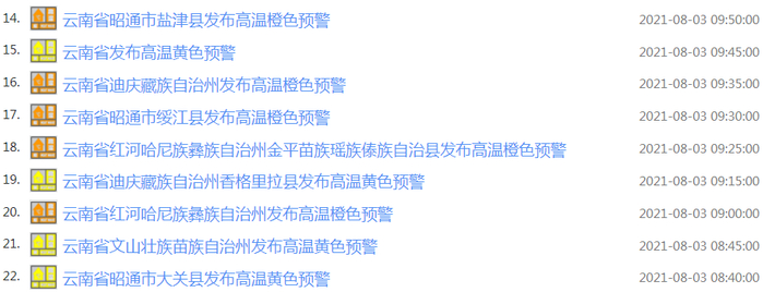 云南各地已收到22条高温预警
