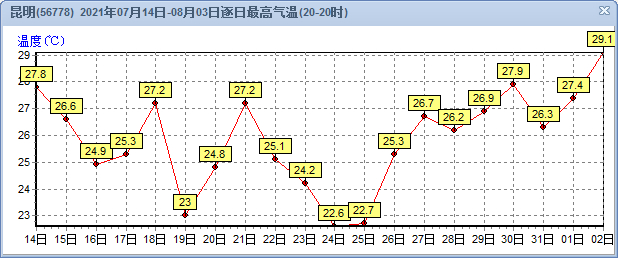 昨天(2日)昆明日最高温
