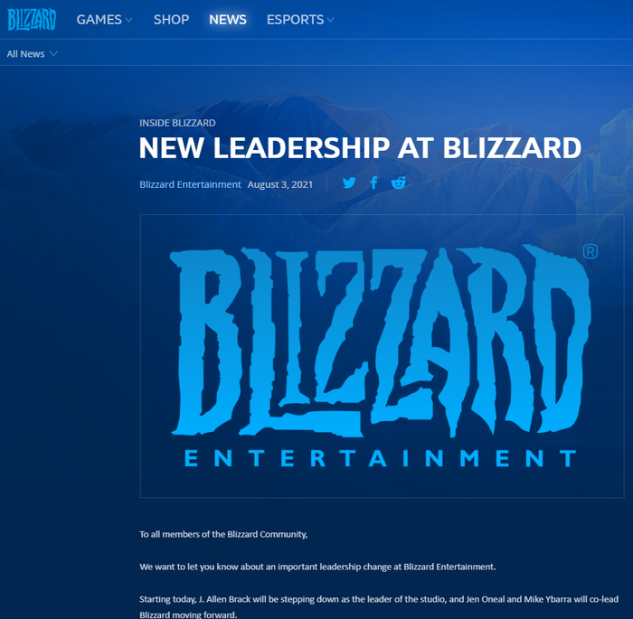 暴雪娱乐在声明中称:“两名领导人均对全体员工做出坚定的承诺:为女性与来自任何性别、种族、性取向和背景的员工提供最安全和舒适的工作环境……Jen和Mike将以关怀、同理心及卓越的奉献精神领导暴雪。”