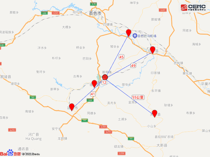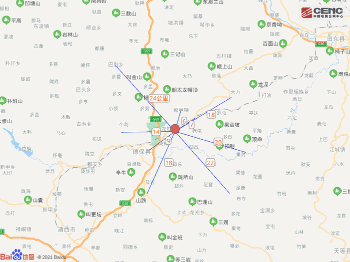 周边县城:震中距德保县12公里、距靖西市41公里、距田阳区45公里、距田东县49公里、距天等县55公里,距百色市59公里,距南宁市177公里。