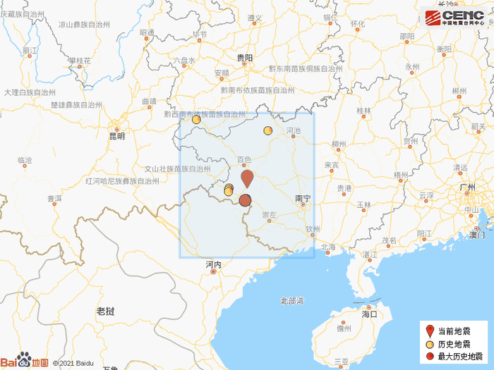 历史地震:根据中国地震台网速报目录,震中周边200公里内近5年来发生3级以上地震共10次,最大地震是2019年11月25日在广西百色市靖西市发生的5.2级地震(距离本次震中55公里),历史地震分布如图。