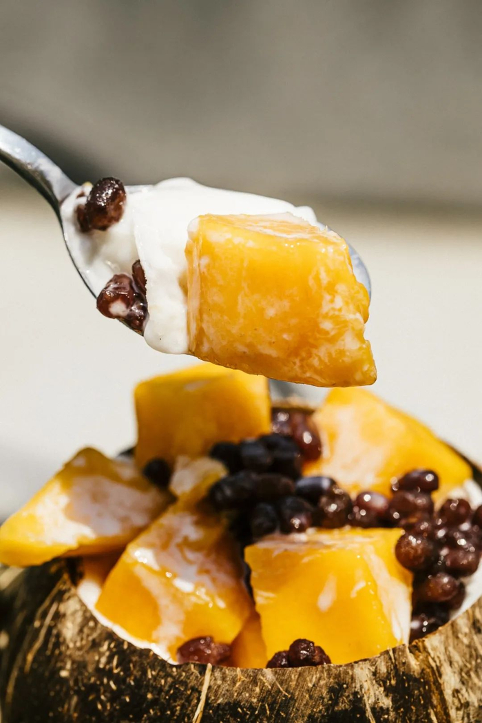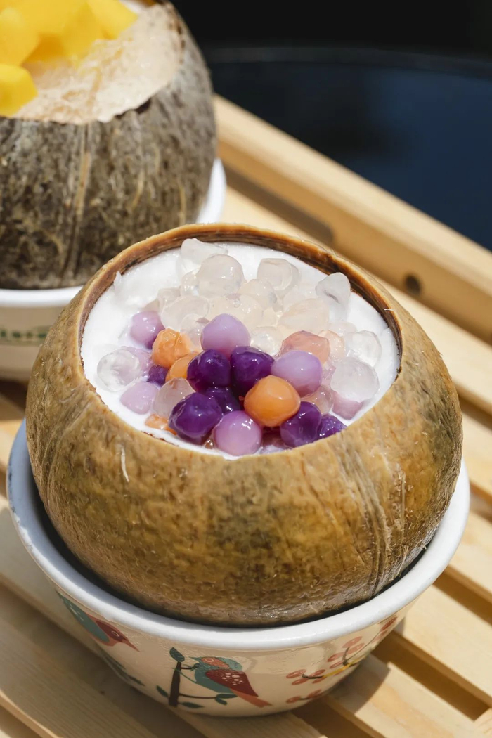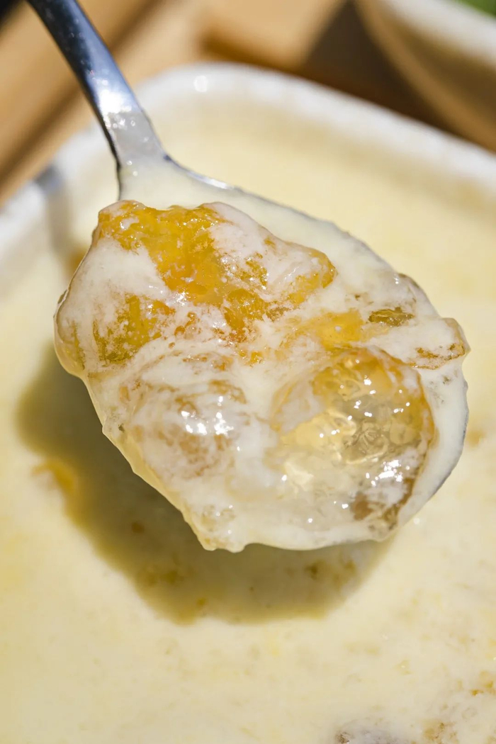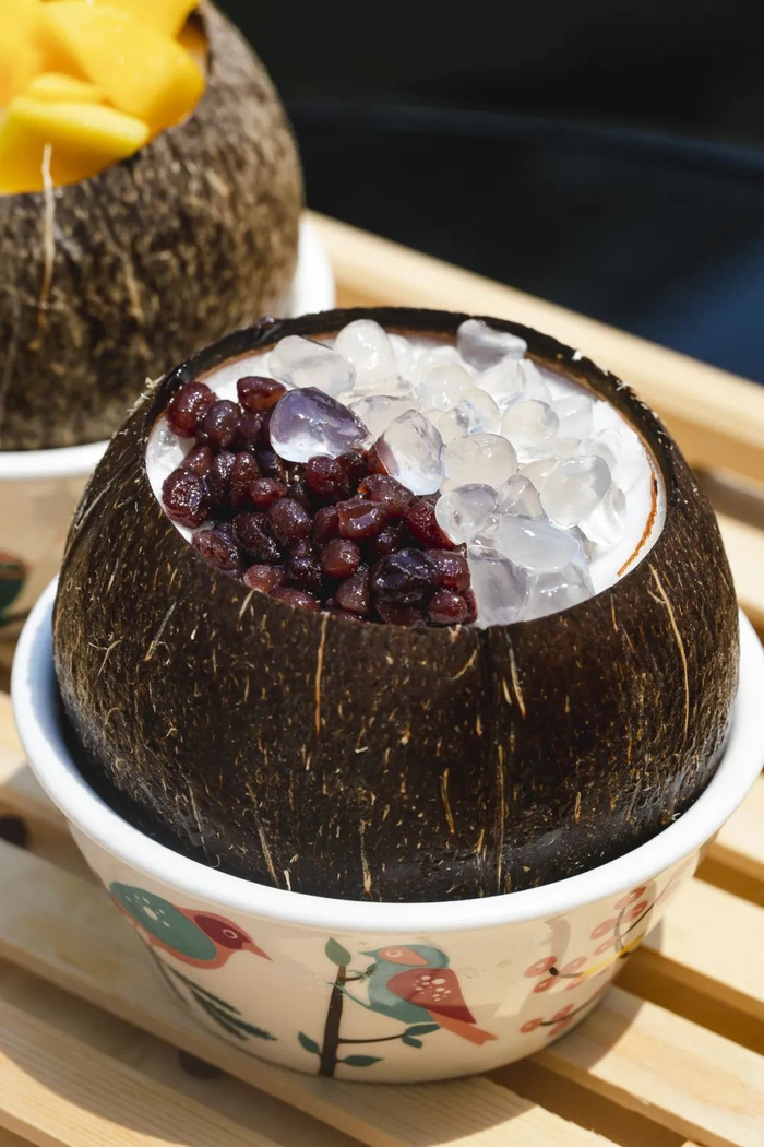 用传统的纱布和筛子三重过滤,椰浆更细腻,入口顺滑,口感像豆腐一般弹嫩,搭配清甜的芒果和软糯的红豆,一次性吃3个都不腻。