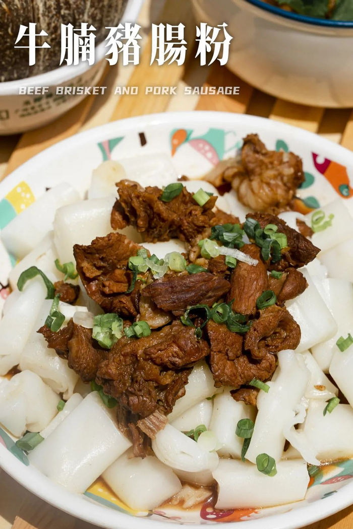 新鲜的牛腩沥水后,用秘制卤水熬煮7-8小时。猪肠粉的米香、牛腩的卤香和鲜香,三香齐相聚,不得不感叹广东人对美食的研究。