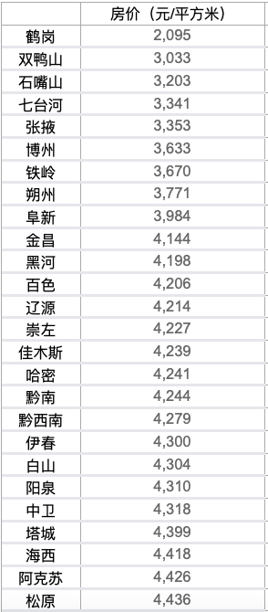 房价最低的十个城市(州)分别是鹤岗、双鸭山、石嘴山、七台河、张掖、博州、铁岭、朔州、阜新、金昌。其中,前9个城市房价低于每平方米4000元。