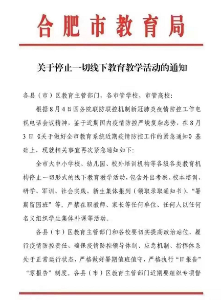 从现在起,合肥市大中小学校、幼儿园、校外培训机构等各级各类教育机构停止一切形式的线下教育教学活动,包含外出考察、校本培训、研学、军训、社会实践、新生集体报到(领取录取通知书)、“暑期留园班”等。严禁在职教师、家长等任何单位、任何人以任何名义组织学生集体补课等活动。合肥市教育局今日下发了《关于停止一切线下教育教学活动的通知》。