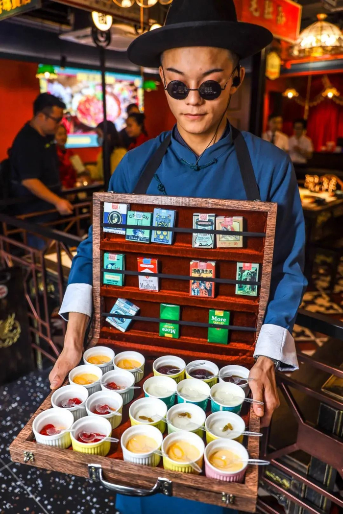 饭后怎么能不填饱第二个甜品胃?火凤祥简直太会了!身着民国服饰的小哥哥,怀里抱着一大盘甜点糖水,重点是无限量免费供应哦~