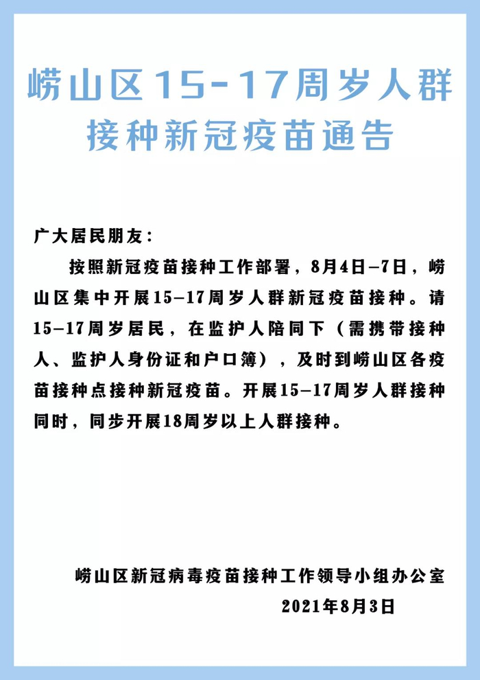 《通告》表示,按照新冠疫苗接种工作部署,8月4日-7日,青岛市崂山区集中开展15-17周岁人群新冠疫苗接种。请15-17周岁居民,在监护人陪同下(需携带接种人、监护人身份证和户口簿),及时到崂山区各疫苗接种点接种新冠疫苗。开展15-17周岁人群接种同时,同步开展18周岁以上人群接种。