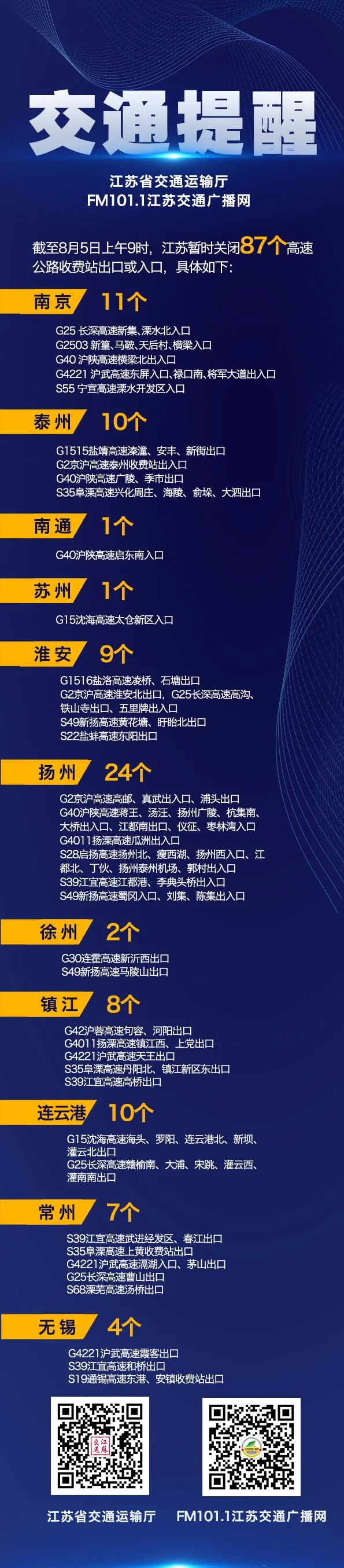江苏省高速公路运行总体平稳。截至8月5日上午9时,南京、泰州、南通、苏州、淮安、扬州、徐州、镇江、连云港、常州、无锡等地区87个高速公路收费站出口或入口暂时关闭。具体如下: