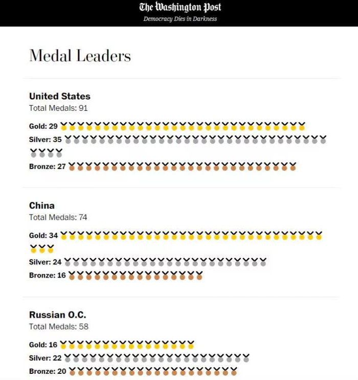 然而在《华盛顿邮报》网站、NBC网站等美国媒体官方网站,美国队以91枚总奖牌的成绩位居“奖牌榜”第一。