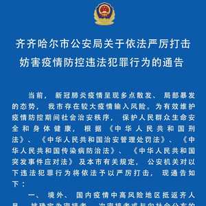 齐齐哈尔市公安局关于依法严厉打击妨害疫情防控违法犯罪行为的通告