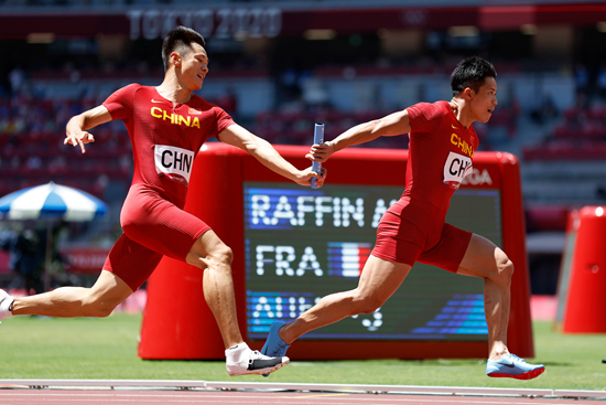 8月5日,在东京奥运会男子4×100米接力预赛中,中国队以小组第一的成绩晋级决赛。视觉中国供图