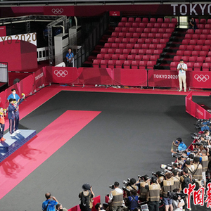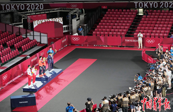 7月26日,2020东京奥运会一场乒乓球比赛决赛的颁奖典礼上,摄影记者保持防疫规定距离,在挡板后拍摄获奖选手。不远处的观众席上几乎没有人,显得十分冷清。出于防疫需要,本届奥运会主办方绞尽脑汁,陆续出台了多项举措。禁止观众入场观看比赛,是他们作出的最艰难,或许也是最正确的决定。